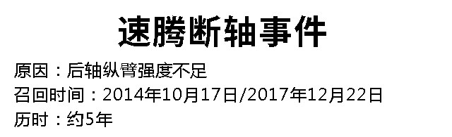 在2012-2014年之间,陆陆续续有车主、媒体报道速腾断轴的事故。而一汽大众方面表示,这些断轴事故都是由于后方经过碰撞导致的,并非产品质量问题。在这众说纷纭的情况下,国家质检总局在2014年8月14日启动调查。2014年10月17日,大众开始召回速腾,并在后轴纵臂上加装一块金属衬板加强强度。