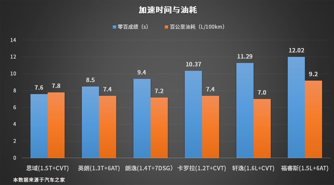 小雅说数据:很明显,小排量涡轮增压发动机比自然吸气发动机表现要更出色。1.5T思域凭借7秒破百的成绩创造平民超跑的佳话,实在令众车折服。不过英朗新推出的三缸发动机也有着不错的动力性能与节油性。卡罗拉、轩逸开起来平顺从容并且节油性强。对福睿斯而言,车重是真心的,油耗高也是真心的。