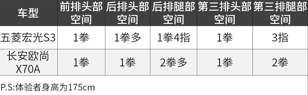 在乘坐空间方面,五菱宏光S3和长安欧尚X70A的表现都差不多,两款车都采用了2+2+3的7座布局,对于一位身高175cm的体验者来说,在车上每个座位都能提供较为充足的空间。