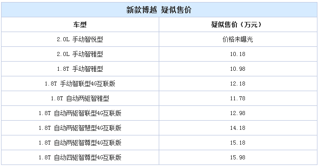 日前,我们从相关渠道获取到了新款博越的疑似售价。参考此前曝光的配置信息,新车将会推出9款车型,但此次我们获取到的疑似售价仅包含除最低配车型外的8款,这8款车型的售价区间为10.18-15.98万,详见下表。根据此前消息,新款博越将于3月正式上市。