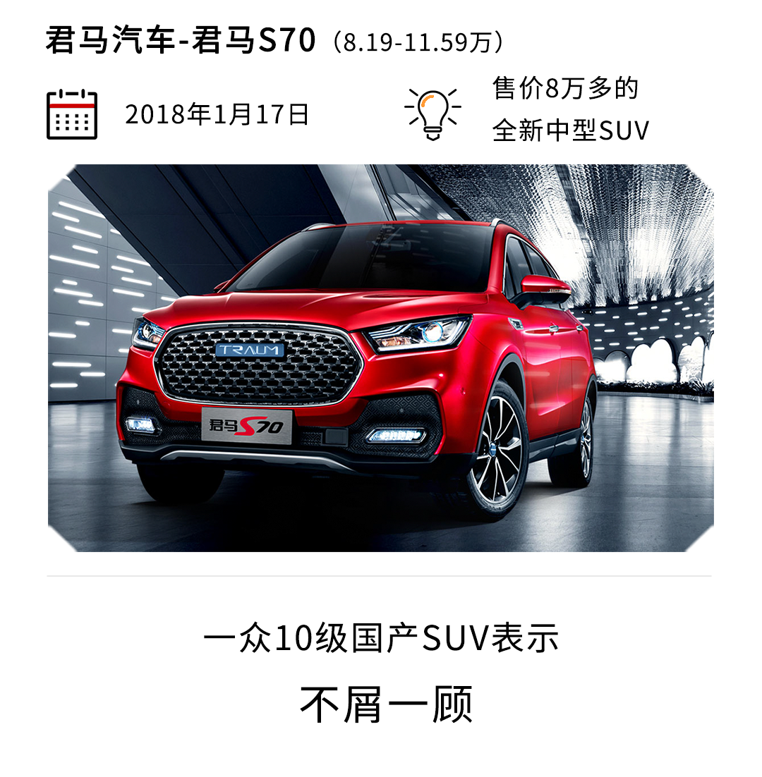 君马汽车的首款产品——君马S70,一姐第一眼看上去就很有“众泰feel”,而它也是走着“低价高配”的路线。听说君马称是定位自主中高端品牌,但是一姐也没觉得它有多高端。因为一姐认为一个中高端品牌的首款车型不应是用大空间、低价格、高配置来吸引消费者的。这款车令一姐最深刻的就是25英寸贯穿式液晶屏,科技感做到了,面子工程也做足了。一姐还没试驾过新车,希望不会带来“华而不实”的感觉吧,不然,君马S70就是个“花瓶子”了。