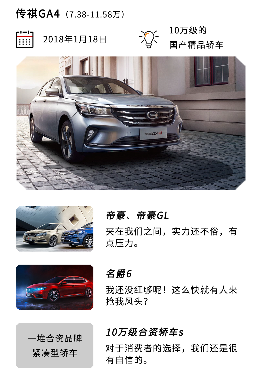 传祺GA4出来后,10万预算要算什么轿车这道问题又多了一个答案了。毕竟7.38-11.58万的售价还是很吸引人的,再加上设计、做工、空间、动力等方面都不赖,没有什么大毛病。