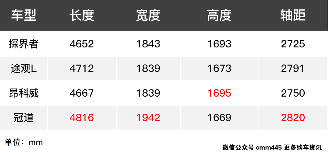 在车身尺寸来看,我们不难发现上汽通用旗下的探界者、昂科威这两款车型的轴距长度较短,但是在车身长度、宽度、高度上和途观L相差无几。