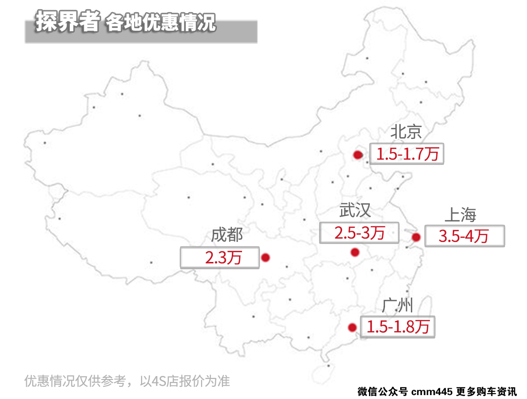 探界者在北京、广州、成都等地方以现金优惠为主,而在优惠更大的上海、武汉等地则一般需搭配添加装饰、店内贷款、店内置换等项目。