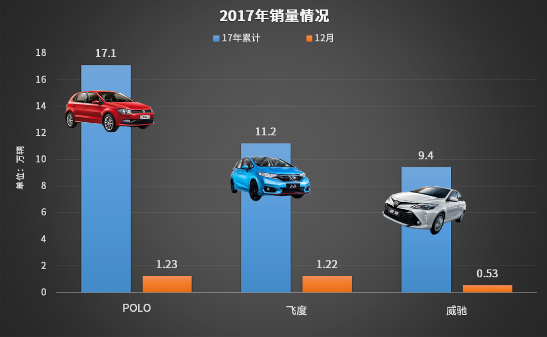 首先我们来看2017年销量,POLO是合资小型车中卖得最好的,飞度与威驰的销量成绩也不错。