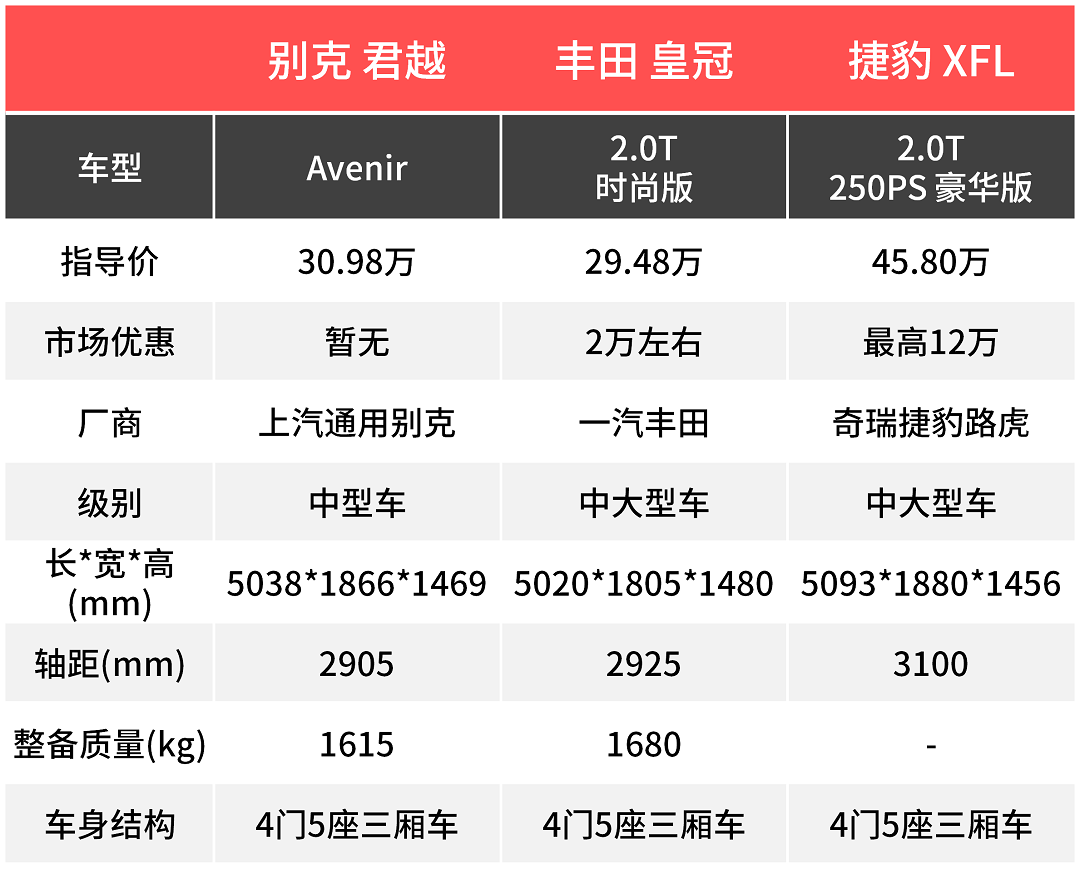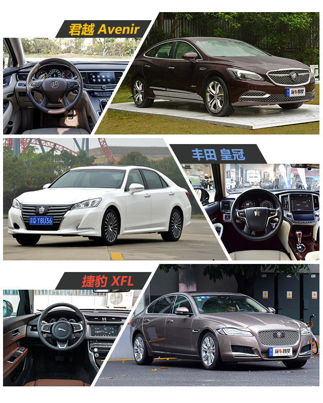教授本次推荐的车型为:来自别克的高端子品牌君越的Avenir版本,指导价为30.98万;丰田的豪华车型皇冠,较多人购买的时尚版,指导价29.48万;还有捷豹中大型车XFL,性价比较高的豪华版,指导价45.80万;三款车价格、尺寸存在一些梯度,适合不同的消费者,其中捷豹XFL优惠幅度比较大,部分地区优惠可以去到10万,很多地方豪华版的实际交易价格在36万左右。