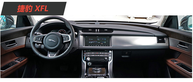 捷豹在内饰上采用了皮革材质+金属,再加以木纹装饰,游艇式的环保座舱设计相对来说是简约一点,但是内饰豪华度也不比BBA弱。