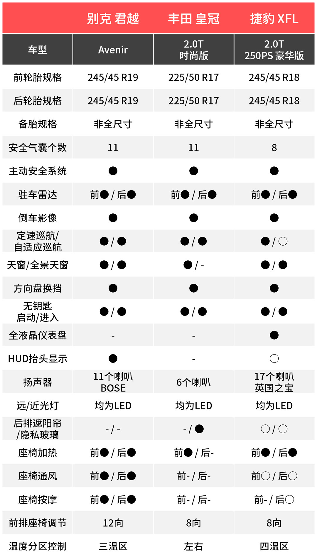 配置方面,三款车一点都不吝啬,基础配置应用尽有,安全配置都很到位,几款车这个配置上都配备了主动安全系统,都是8气囊以上,皇冠和君越Avenir则多出了两个侧气囊和膝部气囊;舒适性配置方面,君越Avenir就比较给力,前后排均配备座椅加热/通风/按摩,非常注重乘员的乘坐感受,而捷豹XFL起码可以选装,皇冠的话就比较可惜,只有前排加热,其余配置方面,捷豹和君越Avenir要比皇冠好一点。