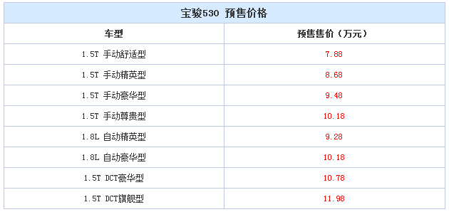 日前,宝骏汽车官方公布了旗下全新紧凑型SUV——宝骏530的预售价格,新车将推出搭载1.5T/1.8L两种动力的共计8款车型,预售价格区间为7.88-11.98万元,并将于3月份正式上市。