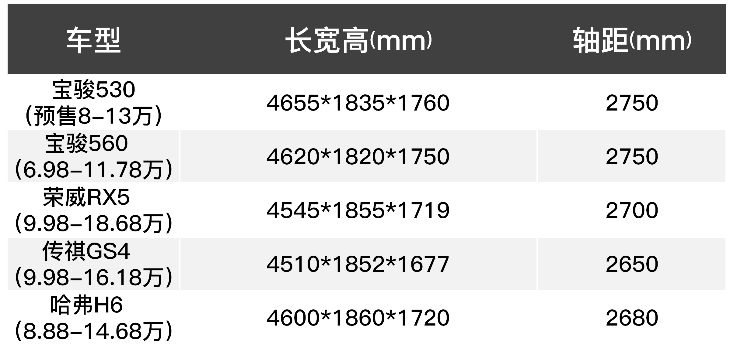开篇也说过,这款宝骏530的定位是高于560,我们从上表也能看到,宝骏530整体的车身尺寸确实要比560大。即便是与目前10-15万级最为热销的国产紧凑型SUV相比,宝骏530的轴距也是处于领先地位。大多数消费者在这个价位选择国产SUV,看中的便是空间与配置,所以宝骏530在空间这一块同样获得相当大的优势。