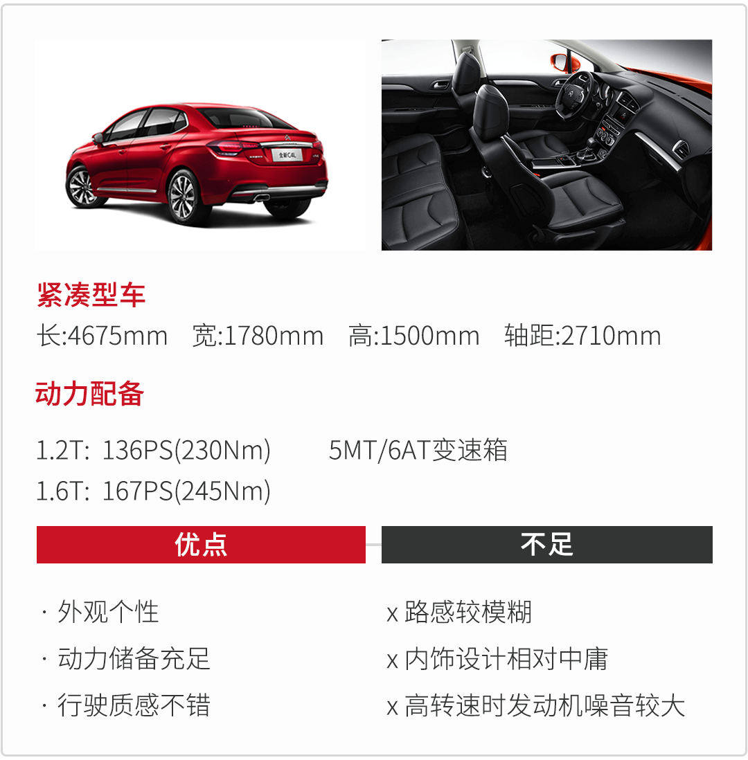 在动力方面,C4L拥有1.2T和1.6T发动机搭配手动或爱信6速手自一体变速器,在排放政策日益严苛的环境下,采用小排量涡轮增压发动机已然是个趋势,C4L身上这副1.6T三缸发动机拥有不俗的账面数据,在实际驾驶中动力充足,家用的话还是完全没问题的。较软的悬架带来了良好的舒适性,对车身侧倾的抑制效果则一般。