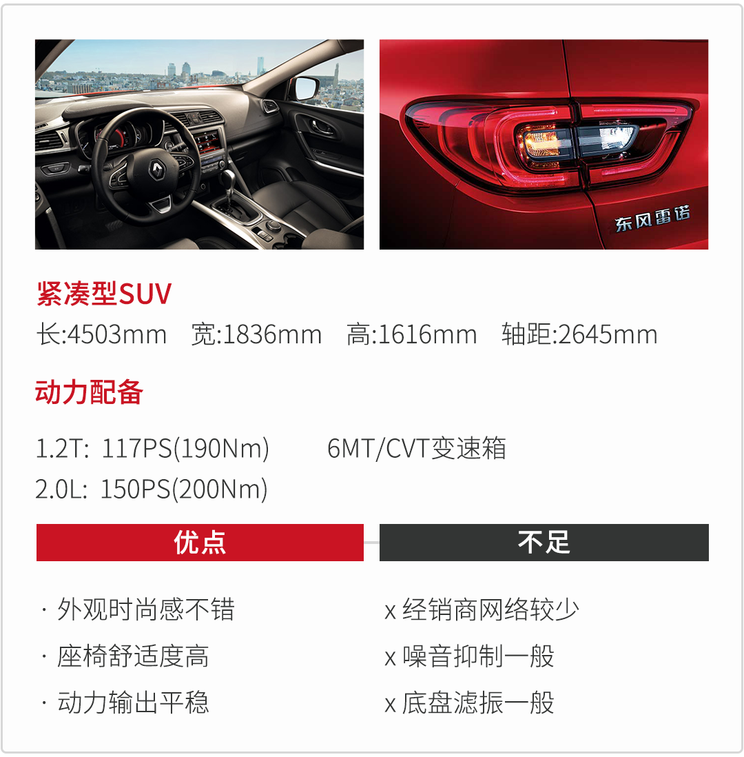 科雷嘉提供1.2T和2.0L发动机供消费者选择,匹配6挡手动或者CVT无级变速器,2.0L发动机和CVT的匹配比较完善,整体调校偏向舒适性,起步平稳,输出线性,在急加速的时候响应并不算很积极,采用的悬架行程较短且调校风格较硬,对路面上的振动过滤效果一般。