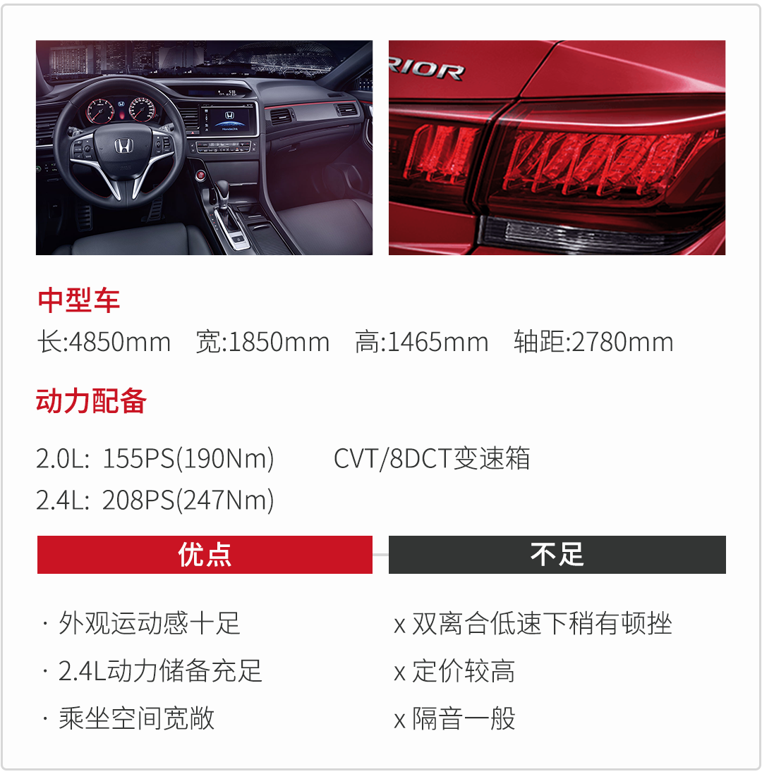 与雅阁相比,思铂睿的外观更具运动风格,车头设计较为扁平,进气格栅上采用本田标志性的镀铬装饰条,全LED大灯颇有本田当家超跑NSX的味道。内饰上,采用稍微向驾驶员倾斜的中控台设计,用料与做工都非常不错,顶配车型上的仿碳纤维装饰板与车内氛围灯更是让内饰的档次上升到新的高度。