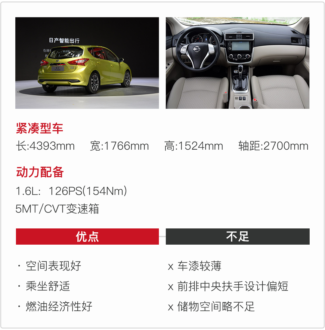 同样能让你省心省油的还有骐达,1.6L+CVT车型能取得10.81秒的零百成绩,同时油耗大概在6.8L/100km左右。另外,大空间也是骐达另一个杀手锏,相比以上两款车型,骐达更注重舒适性的打造,不论是座椅的包裹性还是整车的隔音效果,它都能令人满意,所以它收获了良好的口碑与不错的销量。不过整体配置较低是较为明显的短板,要是在这方面能多多提升,想必会获得更多消费者的青睐。