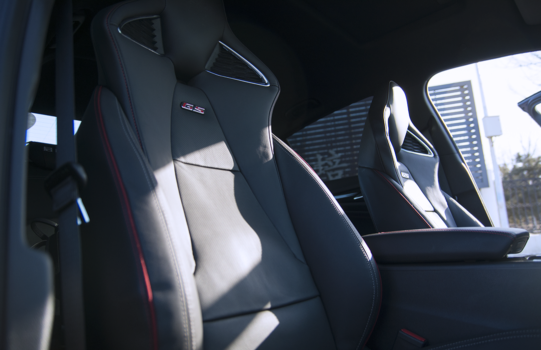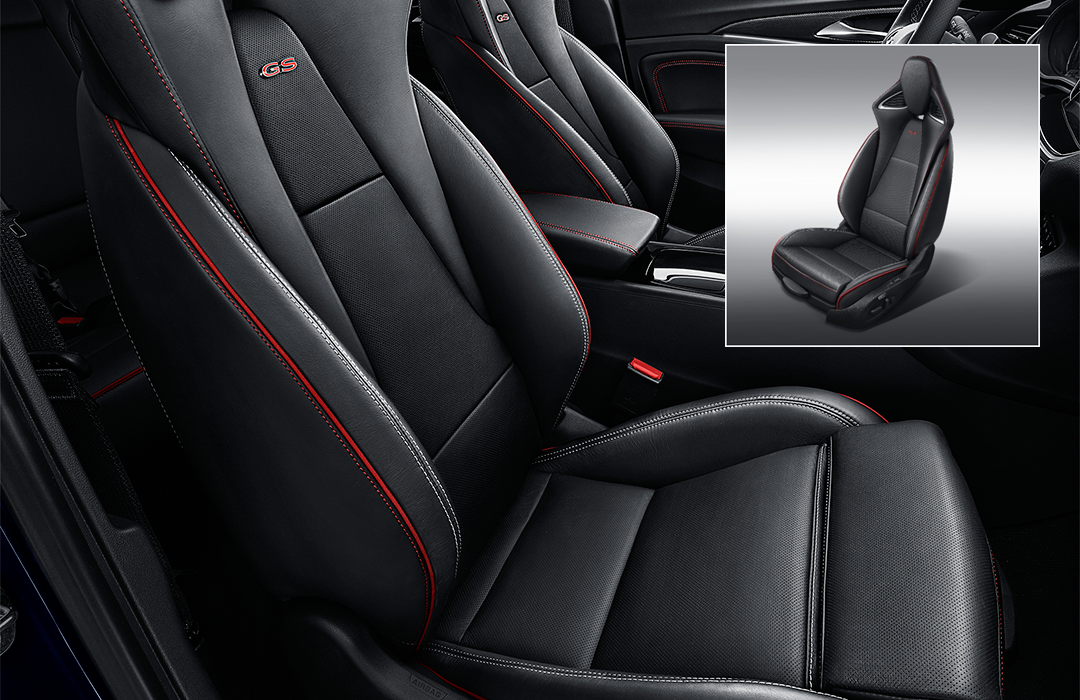 君威GS的展翼式座椅造型设计,与外观的飞翼式家族设计语言相呼应;炫黑真皮材质搭配红色缝线、肩部高亮装饰、醒目的GS标识,都是充满运动气息的设计,能很好地焕发驾驶激情。更重要的是,并不用担心GS标识与肩部装饰会让你的背部感到硌得慌,这都是经过严谨的计算与多次试验后设计出来的,对正常坐姿并没有任何影响。