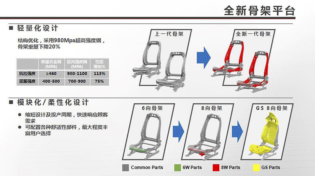 它基于全新座椅骨架平台开发,在轻量化设计上有着不错的造诣。座椅采用980Mpa高强度钢,大幅提升了座椅整体强度(抗拉强度、屈服强度都是普通合金钢座椅的两倍左右),并且与上一代骨架相比,重量下降20%;