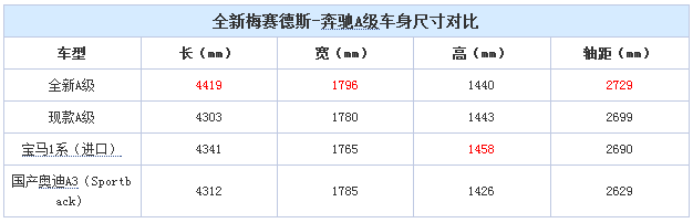 在车身尺寸方面,梅赛德斯-奔驰全新 A 级的长宽高分别为4419mm/1796mm/1440mm,轴距为 2729mm。相比现款,新车在轴距方面增加30mm,前轮距增加14mm。因此,其车内空间有所升级。而对比同级别竞品来看,全新A级在尺寸上具有一定优势。同时,由于车身的增大,内部空间部分也随之增加,车内乘客将获得更加舒适的乘车体验以及更加便捷的储物空间。