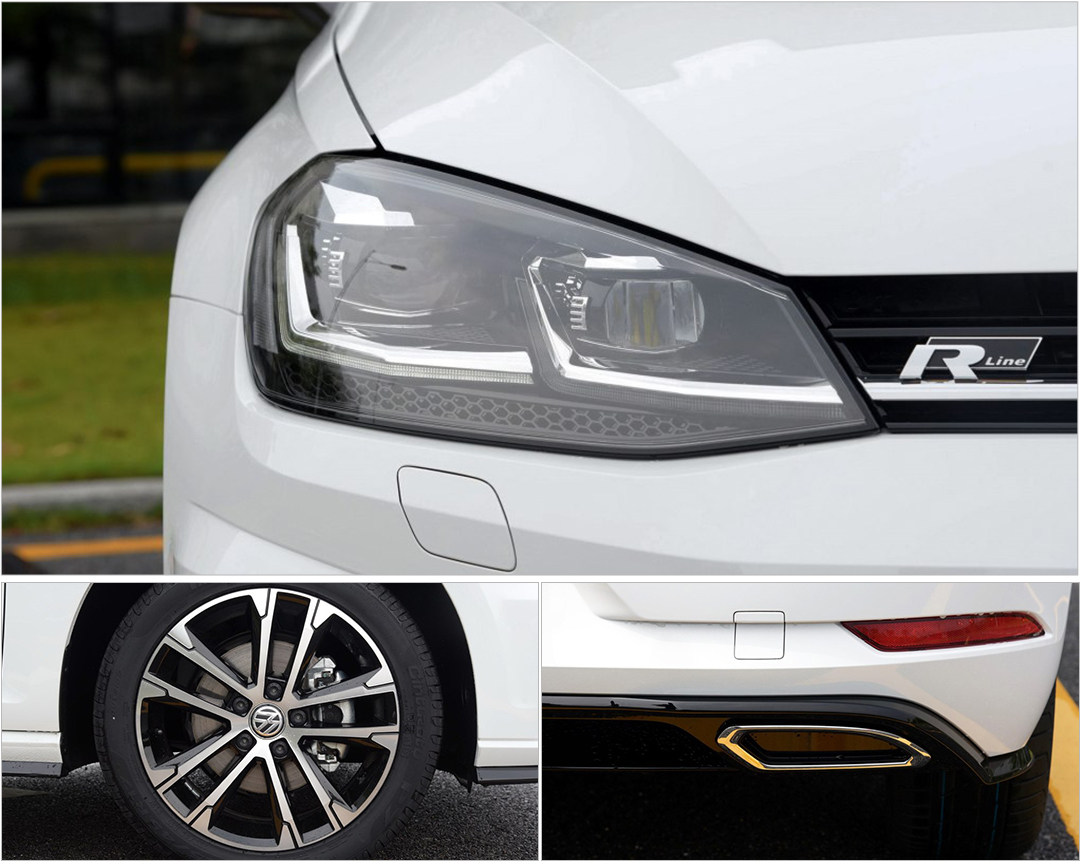 新款的高尔夫在前后杠和大灯的造型上做出了一些小幅调整,线条多了一两分犀利感,而高尔夫R-line版本,前杠的造型比较突出运动感,进气格栅的镀铬线条延伸至大灯,这是大众经典的戏法,给人一种横向拉伸感。