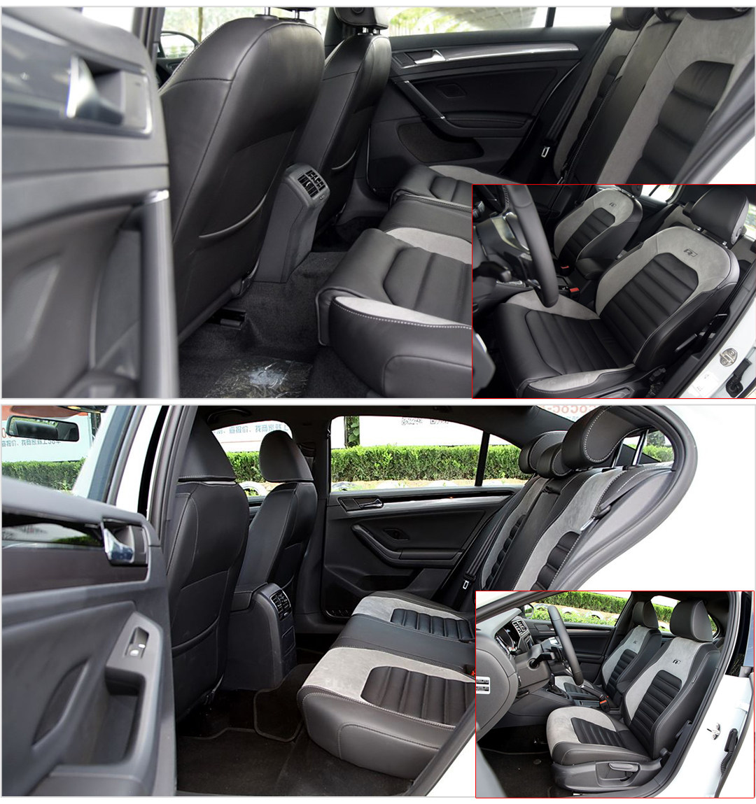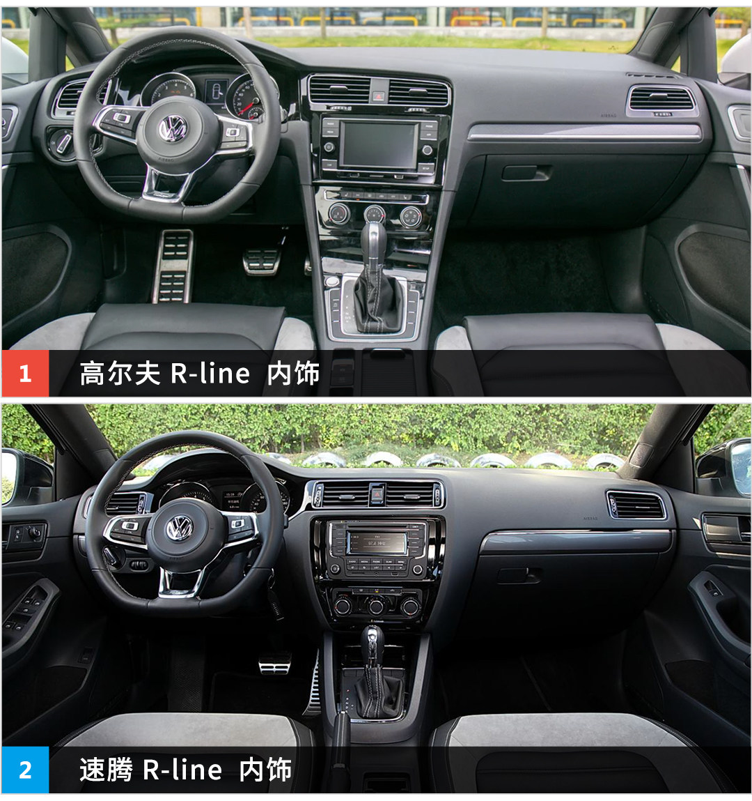 座椅和空间方面,两款车都采用了Alcantara拼皮质的运动座椅设计,并且有R-line标识,包裹性和舒适性都很不错,不过乘坐空间方面可以看出速腾R-line会好一些,毕竟三厢车轴距优势就摆在那儿。