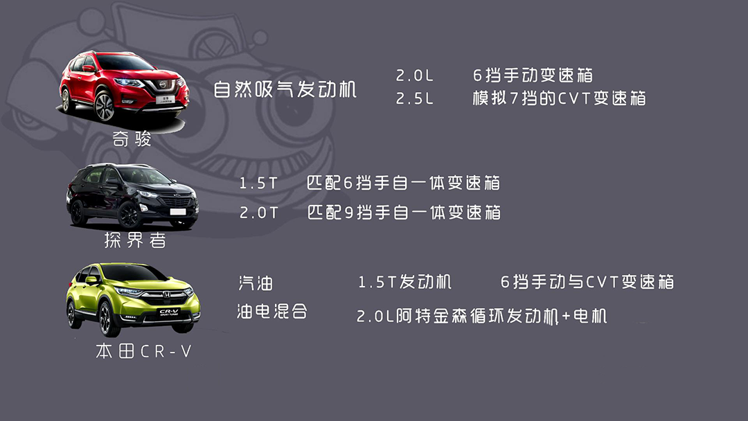 奇骏全系均搭载自然吸气发动机,有2.0L与2.5L可选,匹配6挡手动与模拟7挡的CVT变速箱,探界者1.5T车型匹配6挡手自一体变速箱、2.0T车型匹配9挡手自一体变速箱,而本田CR-V有汽油与油电混合两个版本,前者搭载1.5T发动机,匹配6挡手动与CVT变速箱,后者使用2.0L阿特金森循环发动机+电机的组成。