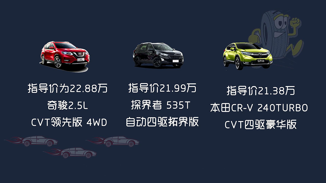 就拿价格接近的车型来说说吧,在这里选取指导价为22.88万的奇骏2.5L CVT领先版 4WD、21.99万的探界者 535T 自动四驱拓界版以及21.38万的本田CR-V 240TURBO CVT四驱豪华版,三者都是四驱版本的入门车型,奇骏的轮圈最大是18英寸的,其余两车都是17英寸,并且只有奇骏的四驱系统带有中央差速器锁止功能,但是奇骏少了胎压监测装置与后驻车雷达,方向盘也不是皮质的,对了它还没有车联网;