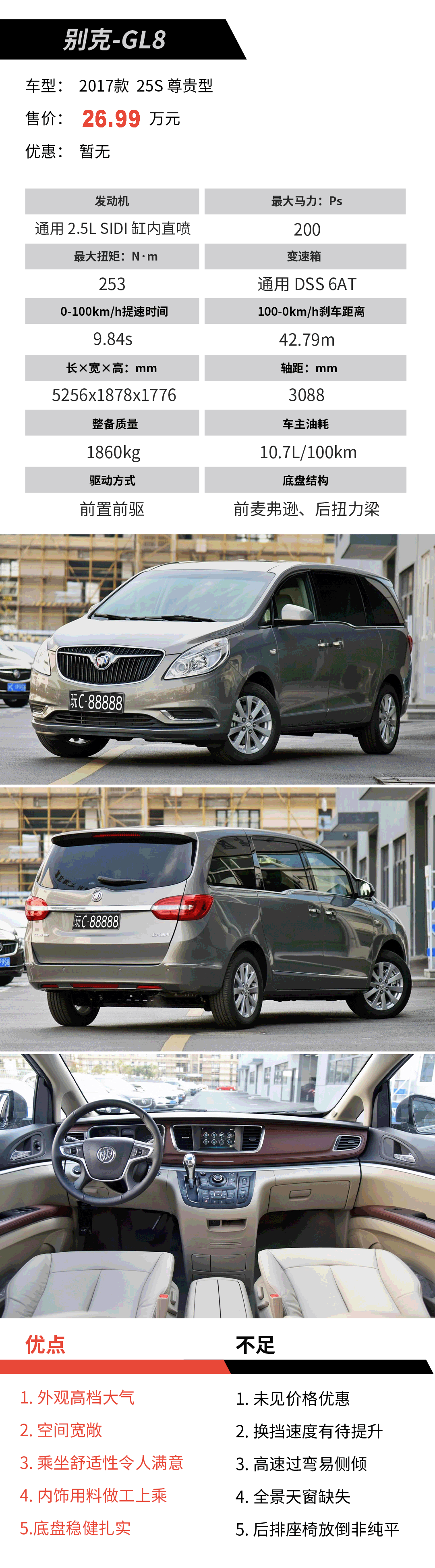 沉稳雅致的外观、豪华精细的内饰做工、游艇般舒适的乘坐质感,GL8陆地公务舱之名不虚。2.5L自吸发动机即便拉着庞大的车身,整体的动力输出依然足够平顺、线性。得益于超5米的车长,不仅乘坐空间绰有余裕,后备箱空间表现也可圈可点。