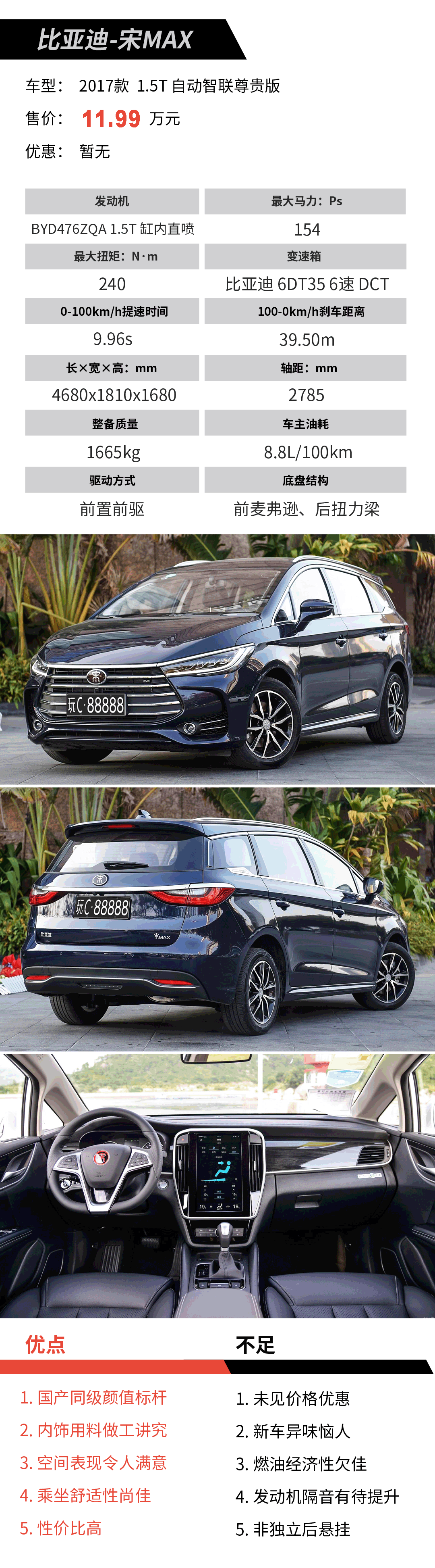 得益于前奥迪设计总监艾格的外观设计及前奔驰S级调校专家汉斯调校的底盘,宋MAX的观感及行驶质感令人满意。而低至0.33的风阻系数、丰富的配置亦为其加分不少。碍于车长,第三排空间稍显局促,进出较费劲,后备箱表现也不甚理想;不过将二三排放倒后 ,可是活脱脱一小货车。