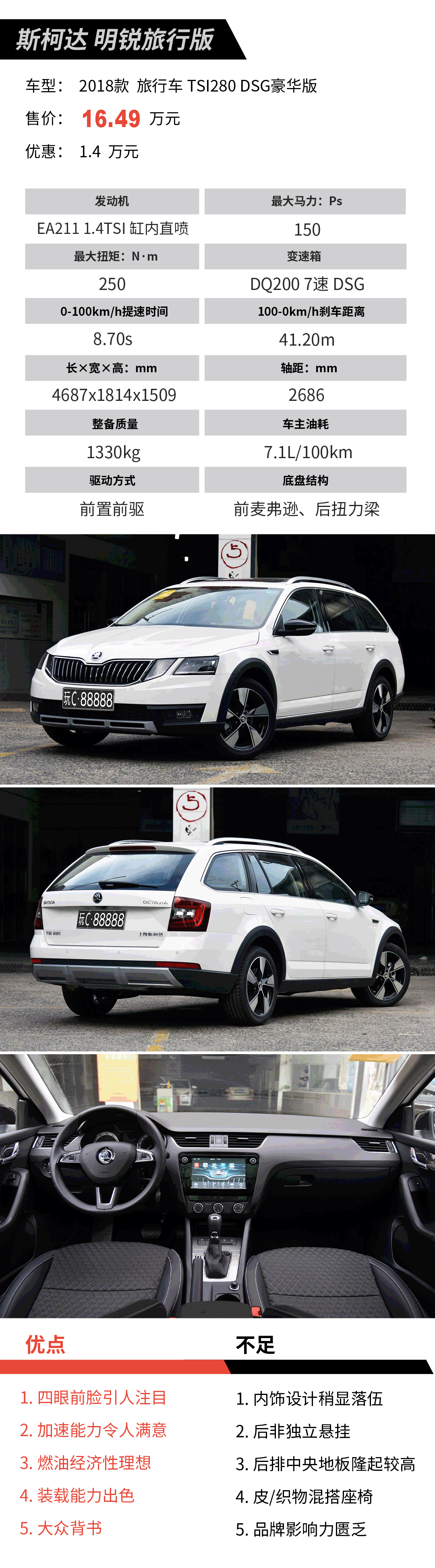 来自大众MQB平台的旅行版明锐,晶璨分体式前大灯与修长饱满的车身相当吸睛。内饰简洁却不含糊,只是中控屏有些反光。起步油门略重,中段加速响应线性,但低挡位换挡有些拖沓,且车身重心偏后以致过坎后排有颠簸感。然而傲视同级的装载能力,丰富的配置及不错的性价比,能不叫人心动?