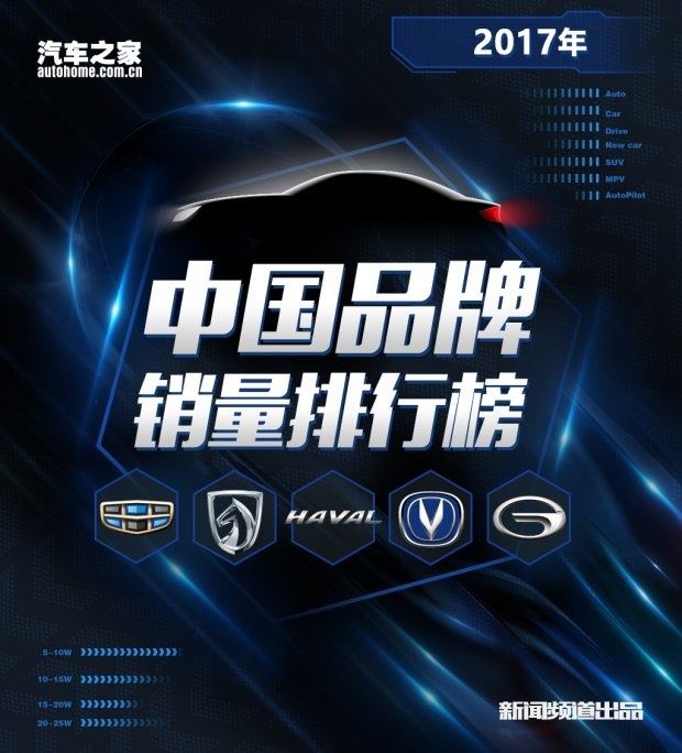伴随着2017年各汽车厂商总销量成绩出炉,我们将在未来一段时间内为大家带来中国品牌、主流合资品牌、豪华品牌2017年度的销量解析。今天率先登场的是近年来发展较为迅猛的中国品牌的2017销量排行榜,其中吉利以120.00万辆的成绩名列榜首,其次是宝骏、哈弗、长安、传祺等几位业内大咖,他们的销量排名较2016年有了明显变化。由于2017年中国车市行情跌宕起伏,那么,这些品牌的销量是否都实现了快速增长?未来他们还将推出哪些走量潜力股?下面,就请您和我一起进入本期5大中国品牌销量解析文章中一探究竟吧(本文所有数据来自中汽协乘用车销量数据)。