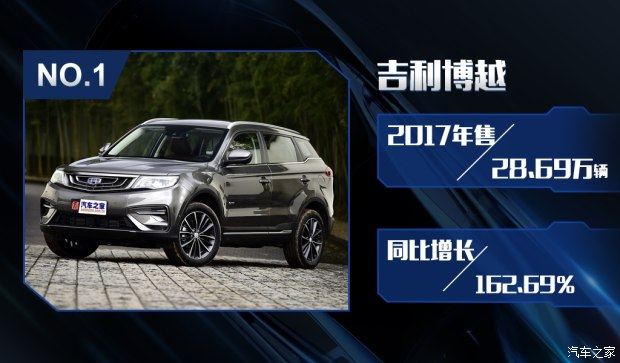 毫无疑问,博越是吉利品牌最受瞩目的SUV产品,自2016年3月上市以来一直保持上升的销量增长趋势,即使在车市萧条的2017年上半年,博越的销量曲线也没有出现下滑的迹象,其2017年总销量达到28.69万辆(286885辆),在整个SUV市场中排名第四,前三名分别为哈弗H6系列(50.64万辆)、宝骏510(36.39万辆)、传祺GS4(33.73万辆)。博越的销量曾一度受到产能不足的制约,随着宝鸡工厂开工,博越的交车效率有了大幅提升,在2017年四季度达到月销三万台的水平。