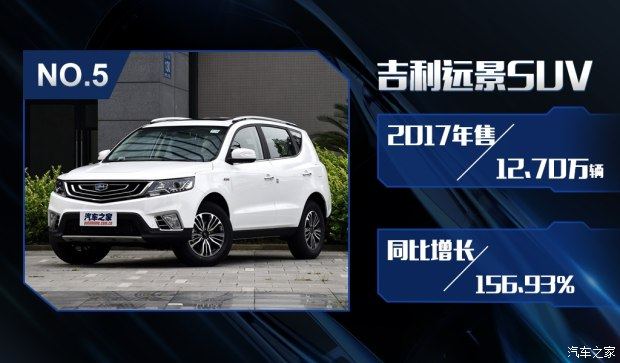 远景SUV在2016年8月上市,是吉利销量前五名中最年轻的一款车型,也是继帝豪GS之后吉利推出的第三款紧凑型SUV,这款起源于全球鹰GX7的全新SUV在吉利成都工厂投产,它的出现证明吉利在紧凑型SUV市场的布局更加细分化之后取得的成功。2017年远景SUV的销量达到127042辆,销量曲线虽然平缓但也呈现出上扬的趋势。未来随着吉利成都龙泉驿项目的扩建完工,预计远景SUV的产能会进一步得到释放。