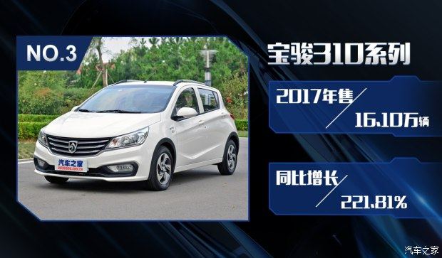 宝骏在产品排兵布阵方面有着自己的独到之处,除了热门的SUV和MPV市场之外,在诸多厂商纷纷投弃权票的小型车市场,宝骏也执意要干一票大的,并且它真的做到了。宝骏310系列(包括宝骏310W)2017年共销售出160993辆,同比增长221.81%,尤其是在2017年9月,1.5L自动挡车型上市后,宝骏310整体销量大幅提升,几乎赶超小型车市场的第一名POLO。伴随着消费升级的大趋势,小型车市场的式微无法抵挡,能够在此存活下去的国产车型会越来越稀少,同时也映衬出宝骏310的难能可贵。