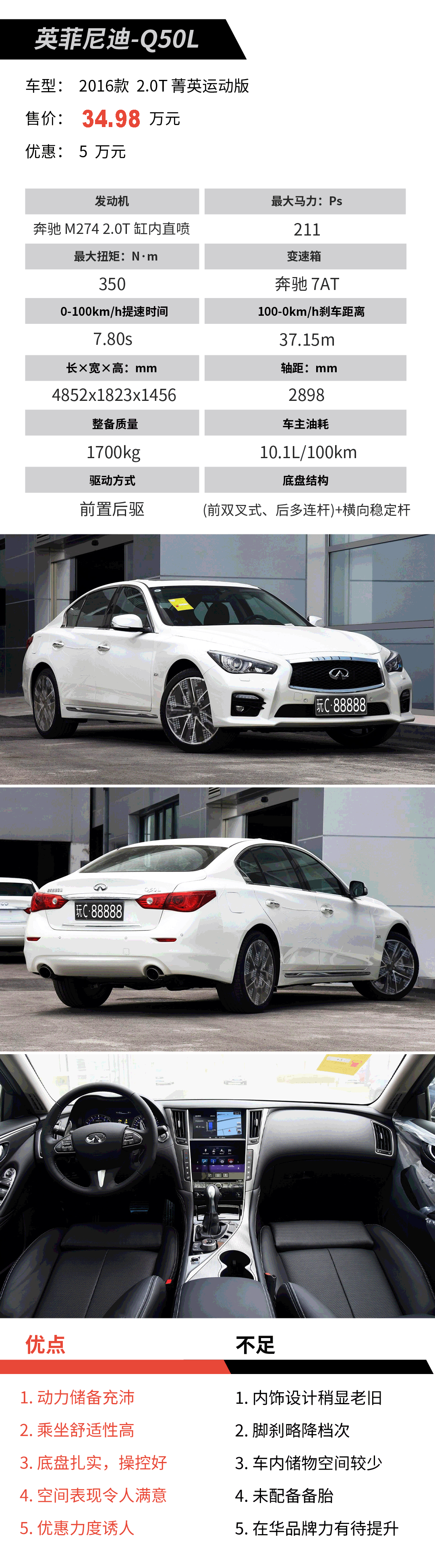 得益于雷诺-日产联盟与戴姆勒的合作,Q50L用上了来自奔驰的动力总成,自行稍作调校后辅以运动性能不俗的底盘及精准的转向系统,操控体验可圈可点。但受羸弱的品牌力、较高的售后维修费用等因素影响,即便优惠力度诱人,销量也不甚理想。