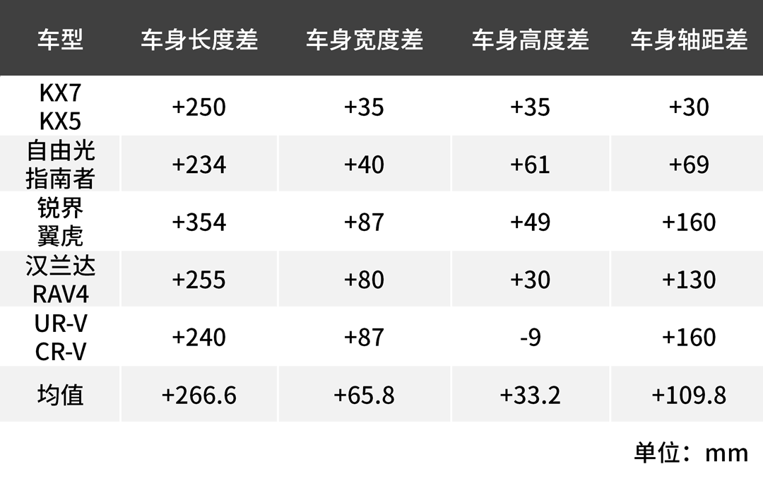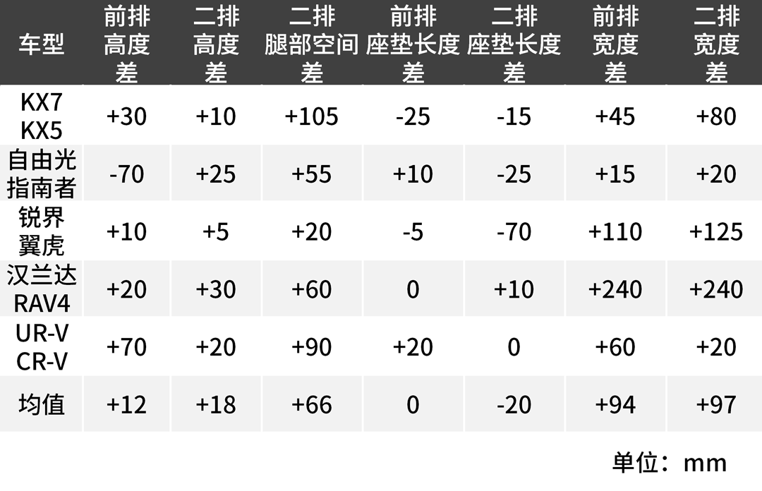 上面这份表格能清楚看到紧凑型SUV与中型SUV在内部空间上的一些主要差距,起码在前后排座垫长度上,紧凑型SUV完全不虚中型SUV。可是在前后排宽度上,紧凑型SUV确实明显吃亏。