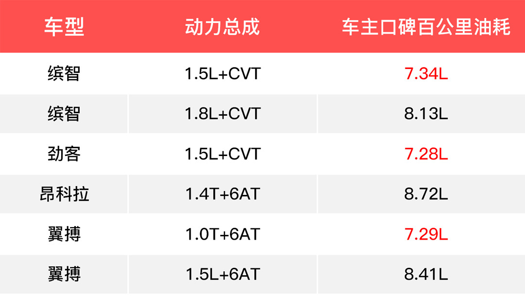以上的油耗数值是来自数百位车主的油耗均值,具有比较高的参考价值!其中劲客和缤智的1.5L车型油耗表现很不错,发动机的表现高效。而翼博的1.0T依托小排量涡轮增压的优势,油耗表现也不差!