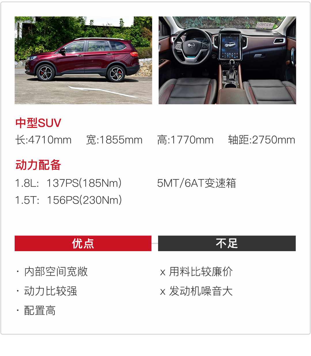 内饰上斯威X7巨大的中控屏也十分有趣,不仅很有科技感,而且实际使用效果也还不错;动力上斯威X7使用了1.8L和1.5T两款发动机,对于这个并不主打动力性能的车来说,这样的两款发动机也算够用了。