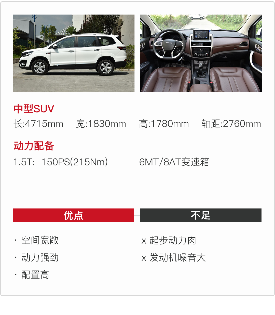 动力上君马S70全系搭载一台1.5T发动机,最大功率156马力,最大扭矩215牛米,发动机数据平平,因此对于动力就别有太高的指望了,不过君马S70的起售价才8.19万,加上杂七杂八的费用落地也不到十万块,十万块买到这么霸气的一款中型SUV,夫复何求呢?