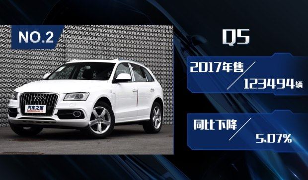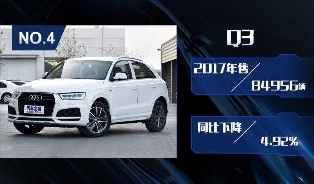 销量排在第四名的是国产奥迪Q3车型,这款车型在2017年共销售84956辆,同比下降了4.92%。奥迪Q3车型销量的下滑除了因为上市时间过长带来的产品力削弱之外,全新宝马X1的上市也给Q3带来了非常大的冲击。不过优惠的增大也让该车在下半年销量有所回升,而国产全新Q3车型的推出时间尚未完全确定,因此现款Q3车型还需要在支撑一段时间。