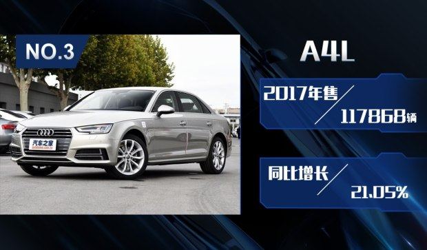 A4L车型凭借着117868辆的成绩来到了第三位,该车型在2016年9月上市,在经历了新老交替的阵痛期之后,该车有了较大的优惠活动,变得更加吸引消费者关注。因此A4L车型的销量一路攀升,同比来看,该车有着21.05%的增幅,成为了奥迪品牌2017年增长最快的车型。但从市场角度来看,曾经的豪华品牌中型车王者已经被奔驰、宝马两位竞争对手反超,能否在2018年逐步找回此前的状态,我们也非常期待。