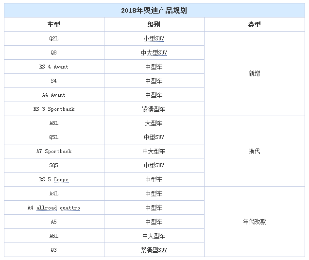 在2017年12月,奥迪正式公布了其2018年的中国市场战略计划,其将在2018年导入16款车型,增强品牌整体竞争力,从而获得更多的市场份额。详见下表: