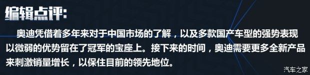 从整体来看,奥迪的销量冠军宝座正在受到前所未有的挑战,以“全系国产车型”为销售主力的优势也在逐渐被吞噬。虽然新A8L、新A7 Sportback有着不错的产品力,Q2L和Q8也将进入全新的细分市场。但如果想依赖这些车型获得销量大幅增长,甚至甩开后方追兵也有些不切实际。因此,现阶段奥迪品牌唯有继续采用增配+优惠的方式,稳固现有销售体量,尽可能的保持销量优势,来等到市场完全能接受全新Q5L。