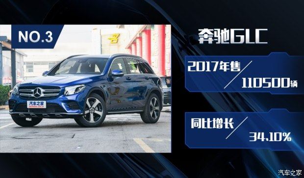 国产GLC是奔驰排名第三的畅销车型,其在今年累积销售110500辆,与去年的销量相比,同比增长34.10%,增长幅度十分明显。这款车最早是在2015年底上市销售,并取代了此前奔驰GLK车型。全新设计的外观以及国产后更加亲民的价格让这款车更受欢迎,2017年GLC的销量开始逐渐升温,可以看出其与奔驰E级车型销量不相上下。