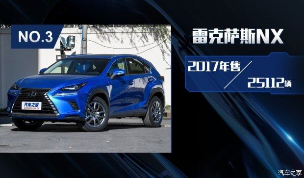 雷克萨斯NX车型在2017年共售出25112辆,作为雷克萨斯SUV车型的入门级产品,NX车型有着更为亲民的价格以及更加犀利的外观设计,因此该车的目标客户群体也更加年轻。目前正在销售的现款雷克萨斯NX在2017年成都车展中正式上市,新车在动力方面的出色表现将为其增色不少。