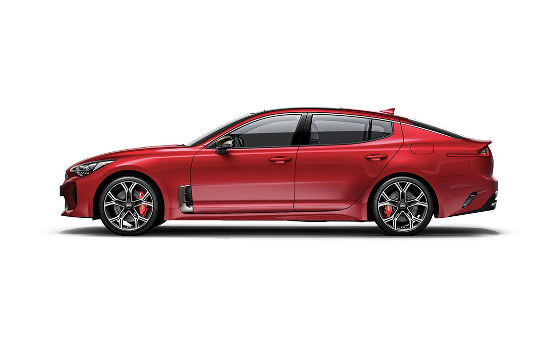 轴距长2905mm的起亚Stinger被划分至中大型轿跑范畴,出自国际顶尖设计师彼得·希瑞尔之手。熏黑大灯下方的真进气孔起到导流、散热作用,前轮后方镂空侧腮同样能导流,可惜机盖假进气孔仅作装饰,钨钢电镀处理后视镜成点睛之笔。