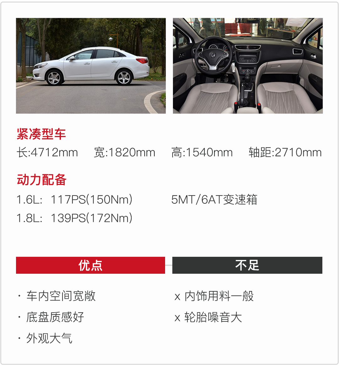 东风风神L60在紧凑型轿车中属于绝对的大块头了,它的长度达到了4712mm,宽度达到了1820mm,轴距也达到了2710mm,实际上L60就相当于是标致老款的408;408定位于大紧凑型轿车,在底盘功力上相当出色,L60也继承了408的这个优势,在操控性以及驾驶质感上L60可以说是自主品牌中的佼佼者。