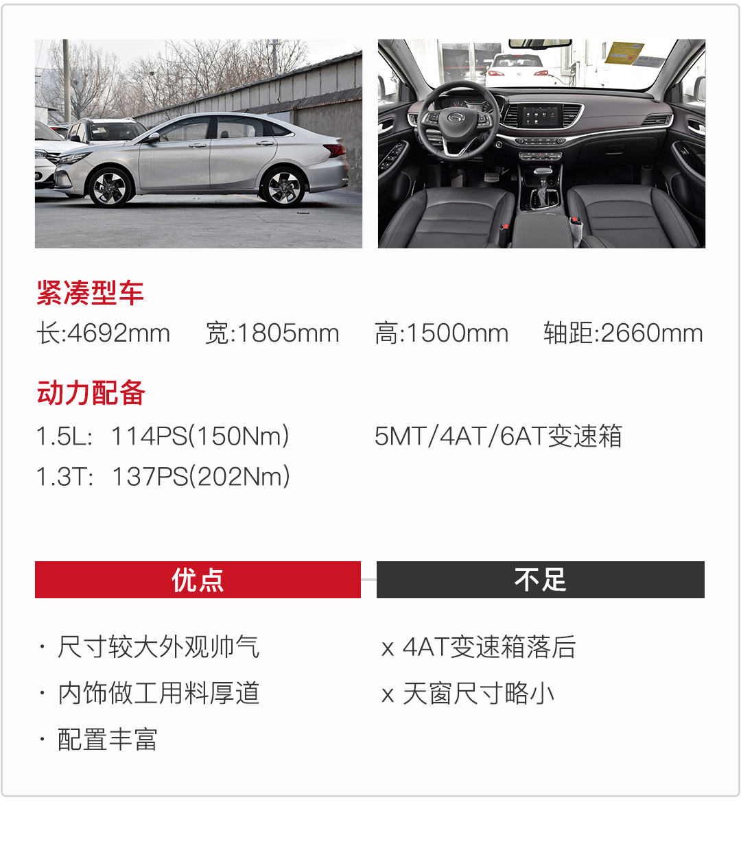 传祺GA4也拥有着不小的尺寸,这也意味着它的内部空间比较不错。不过传祺GA4最大的看点应该在于它的高配置以及动力系统了,传祺GA4使用了1.5L和1.3T两款发动机,与之匹配的是5挡手动/4挡自动和6挡自动变速箱。这套动力系统胜在传动效率足够高,因此在动力和油耗的兼顾上做的比较到位,而即使是传祺GA4的最低配车型也标配了车身稳定系统、倒车雷达、铝合金轮圈、多功能方向盘、前后中央扶手以及后排出风口,在配置上传祺GA4比较有看点。