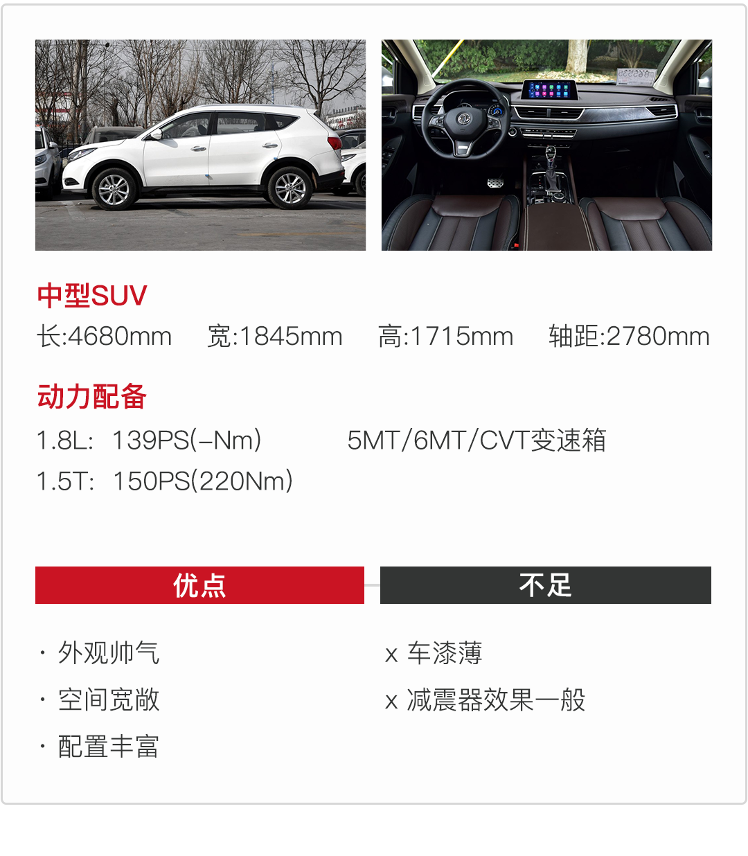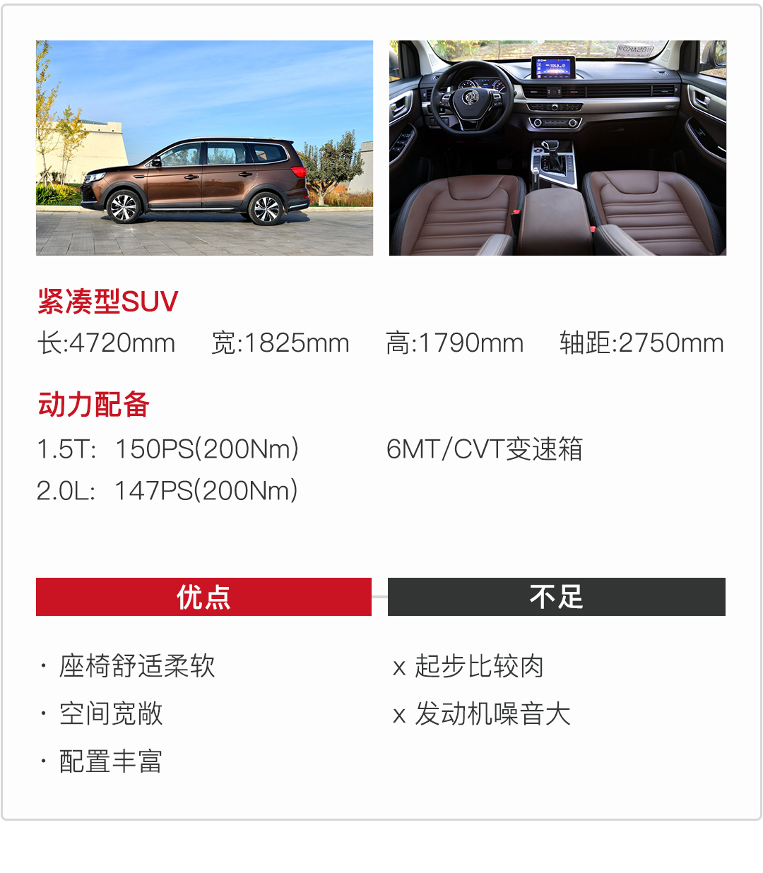 虽然景逸X6定位于紧凑型的SUV,但是它的长度已经超过了4.7米,比风光580更加长。轴距也达到了2750mm,也就是说它的空间尺寸和中型SUV几乎是没有区别的。因此在空间上也不用过于担心。动力上景逸X6也使用了一套1.5T发动机加CVT的动力组合。这台1.5T发动机型号为4A91T,虽然它的输出数据不高,但是在虎哥之前的实测中这款发动机的表现却是不错的。