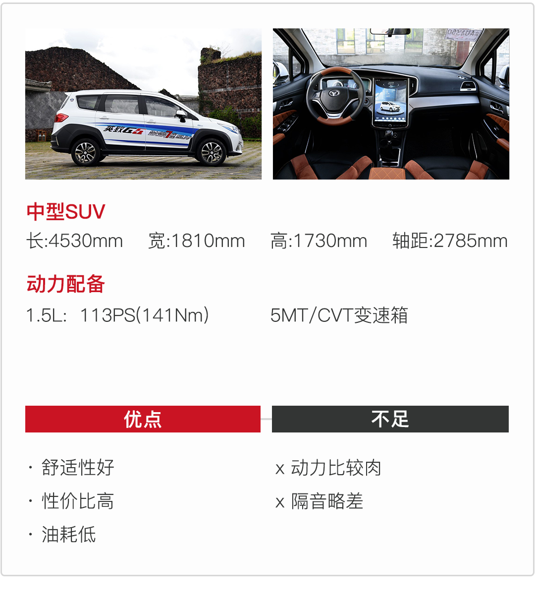 除此之外,英致G5的自动挡车型起售价为7.98万,也就说9万多的价格就可以落地。在动力上英致G5的自动挡车型使用了一套1.5升自然吸气发动机加CVT无级变速器的动力组合,发动机最大马力113匹,最大扭矩140牛米,偏小的动力输出也就意味着他的性能表现不咋地;不过这个价格买一辆自动挡七座SUV,也不能强求太多了。