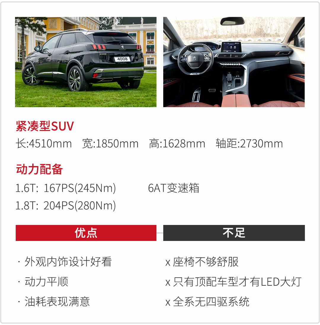与激进的外观不同,标致4008的动力输出比较平顺线性,缺乏了一点激情。而悬挂方面,法系车一向喜欢的后扭力梁在这款标致4008身上也得到很好地发挥,舒适但并不松散。但比较可惜的是,这款标致4008全系没有四驱系统,也许法国人没有考虑到喜欢浪漫的人也会有越野的需求吧。