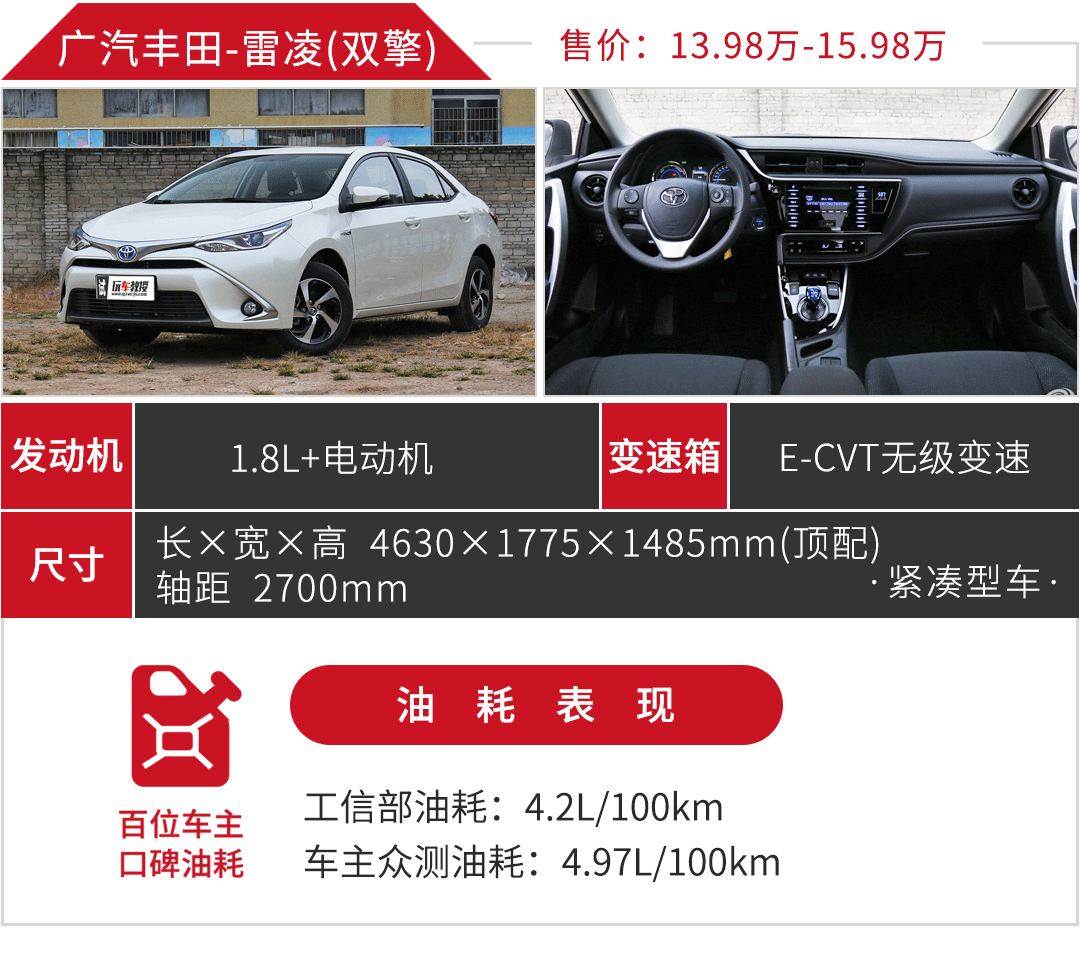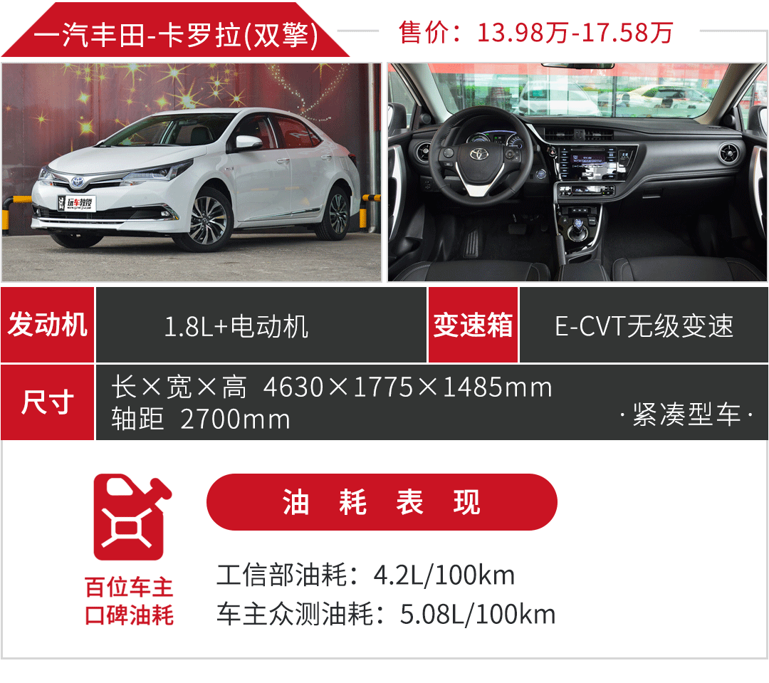 卡罗拉双擎与雷凌双擎为同一套动力系统,拥有相同的四大优势,在油耗方面“电动机”的贡献很大,另外1.8L阿特金森循环发动机采用电动水泵新技术,取代传统的皮带结束,让发动机运转效率更高,同时将油耗和排放降到更低。